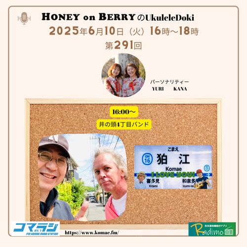 こまえエフエム(コマラジ)85.7MHz 毎週火曜日 16時~18時 HONEY on BERRYのUkulele Doki 生放送中です。コマラジ公式サイトまたはレディモアプリでお聴きいただけます。