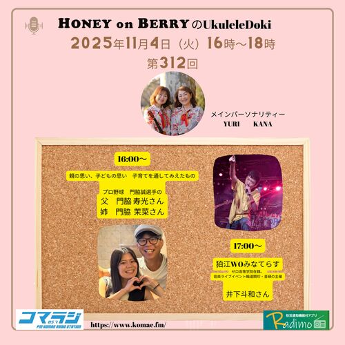 SWEET TIME PARADISE HONEY on BERRYの『Ukulele Doki』 【放送時間】16:00~18:00 【パーソナリティ】HONEY on BERRY(YURI、KANA) HONEY on BERRY公式サイトhttps://honeyonberry.club/ 【コマラジ聴取方法】 ■狛江市にお住いの皆さま ラジオは85.7MHz■WE…